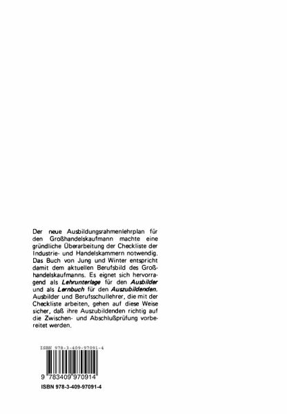 1 Beschaffung.- 1.1 Wareneinkauf.- 1.2 Branchenübliche Warenkenntnisse.- 2 Absatz.- 2.1 Warenverkauf.- 2.2 Markt und Werbung.- 2.3 Kalkulation und Preisgefüge.- 2.4 Warenversand einschließlich Transport-und Speditionswesen.- 3 Rechnungswesen.- 3.1 Zahlungsverkehr.- 3.2 Buchführung.- 3.3 Kostenrechnung.- 3.4 Kreditwesen und Finanzierung.- 4 Organisation und Verwaltung.- 4.1 Gliederung, Aufgaben und Bedeutung des Groß- und Außenhandels im Rahmen der Gesamtwirtschaft.- 4.2 Organisation des ausbildenden Unternehmens.- 4.3 Büroarbeiten; Datenverarbeitung.- 4.4 Betriebliches Steuer-und Versicherungswesen.- 5 Personalwesen.- 5.1 Personalverwaltung.- 5.2 Lohn- und Gehaltsabrechnung.- 5.3 Arbeitsschutz und Unfallverhütung.- 5.4 Ausbildung im ausbildenden Unternehmen.- 6 Warenentnahme, Warenlagerung und Warenausgabe.- 6.1 Fachrichtung Großhandel.- 6.2 Fachrichtung Außenhandel.- 7 Volkswirtschaftlicher Anhang.- Sachwortverzeichnis.