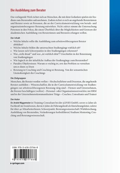 Der Stand der Dinge - Perspektiven und Ergebnisse der aktuellen Forschung.- Was ist Beratung? Was ist eine Organisation? Eine Begriffs- und Standortbestimmung.- Objekttheorien der berufs- und organisationsbezogenen Beratung.- Theoretische Grundlagen von Beratungsansätzen im Feld Bildung, Beruf und Beschäftigung und Entwicklung eines an operativen Beratungstheorien orientierten Kompetenzrasters.- Die kompetenzorientierte Programm- und Studiengangsentwicklung für die arbeitsweltbezogene Beratung.- Darstellung wissenschaftlicher Ergebnisse zur Curriculagestaltung im Kontext der berufs- und organisationsbezogenen Beratung.- Methodik der Untersuchung.- Beantwortung der Forschungsfragen auf Grundlage der Analyseergebnisse.