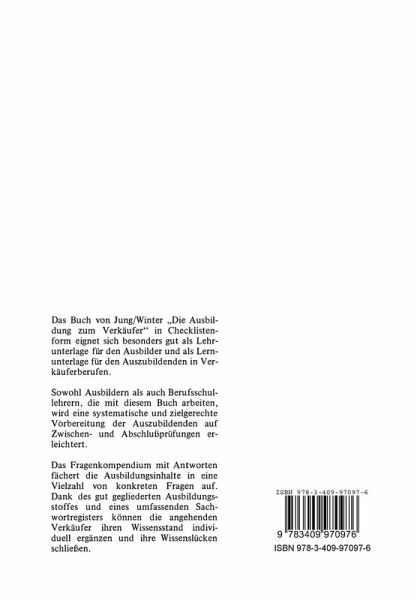 Vorwort.- Ausbildungsplan.- Einführung.- 1. Zielsetzung und Organisation des Betriebes.- 2. Betriebsordnung.- 3. Aufgabenbereich der Mitarbeiter.- 4. Rechte und Pflichten aus dem Ausbildungsverhältnis.- 5. Unfall-, Sicherheitsvorschriften, Jugendarbeitsschutz.- Warenannahme und Lagerung.- 6. Prüfen und Registrieren nach Art, Menge, Preis und Güte.- 7. Feststellen und Behandeln von Mängeln.- 8. Fachgerechtes Transportieren, Verteilen, Lagern und Pflegen.- 9. Einschlägige Rechtsvorschriften (Mängelrüge, Hygiene- und Haltbarkeitsvorschriften).- Vorbereitung für den Verkauf.- 10. Zusammensetzung der Verkaufspreise kennenlernen.- 11. Preisauszeichnung.- 12. Auffüllen der Warenbestände im Verkaufsraum.- 13. Ausfüllen von Bedarfsmeldungen.- 14. Ware im Laden verkaufsfördernd anordnen.- 15. Mithilfe bei der Schaufenstergestaltung.- 16. Umgang mit Arbeitsgeräten, Maßen und Gewichten.- 17. Rechtsvorschriften: Preisauszeichnungs-Verordnung, Meß-und Eichwesen.- Warenkunde.- 18. Natürliche und technische Eigenschaften der Ware.- 19. Handelsübliche Bezeichnungen nach Klassen, Größe, Gewicht usw.- 20. Funktionseigenschaften (Gebrauchs- und Pflegeanleitungen).- 21. Mögliche Prestigewerte.- 22. Lernen mit warenkundlichem Wissen (Pos. 18-21) zu argumentieren.- Verkaufs- und Beratungsgespräch.- 23. Kunden empfangen (gegebenenfalls zur Fachkraft begleiten).- 24. Zuschauen und Zuhören bei Verkaufsgesprächen.- 25. Anhaltspunkte zur Einschätzung von Kundentypen.- 26. Vorlage und Verkauf von Waren nach bestimmten Kundenwünschen.- 27. Klären und sich einstellen auf Kundenwünsche.- 28. Durch Vorlage und Argumentation Kundenwunsch mit Warenangebot in Einklang bringen.- 29. Warenbezogene Einwände entkräften.- 30. Preisbezogenen Einwänden begegnen (z. B.Preisleistungsrelation).- 31. Kunden zu Zusatzkäufen anregen.- Verkaufstechnische Sonderfälle.- 32. Kunden für Ausweichartikel gewinnen (Ersatzverkauf).- 33. Bedienen von Spätkunden.- 34. Gleichzeitiges Bedienen mehrerer Kunden.- 35. Bedienen von alten Leuten, Kindern, Ausländern.- 36. Verhalten bei Umtausch und Reklamation.- 37. Verkauf aus dem Schaufenster.- 38. Rechtsvorschriften: Kaufrecht, Geschäftsfähigkeit, Vollmacht.- 39. Rechtsvorschriften: Unlauterer Wettbewerb, Zugabeverordnung, Rabattgesetz.- 40. Rechtsvorschriften: Sonderangebote und Sonderveranstaltungen (SSV-WSV).- Warenausgabe, Kassenwesen, Zahlungsverkehr.- 41. Ausschreiben von Kassenzetteln und Rechnungen.- 42. Bedienen der Kasse (Barverkehr).- 43. Mitarbeit bei der Kassenabrechnung.- 44. Entgegennahme bargeldloser Zahlungsmittel.- 45. Rechtliche Bestimmungen: z. B. Scheckrecht.- 46. Verpacken der Ware am Verkaufsplatz bzw. Packtisch.- 47. Aushändigen der Ware, Verabschieden des Kunden.- 48. Behandeln und Ablegen von Belegen.- 49. Mitarbeit im betrieblichen Rechnungswesen.- 50. Mitarbeit bei der Inventur (Bestandsaufnahme, Einführung in die Auswertung).- Exkurse.- 1. Persönlichkeit des Verkäufers.- 2. Personal-und Sozialwesen.- 3. Warenversand.- 4. Werbung.- Sachwortverzeichnis.