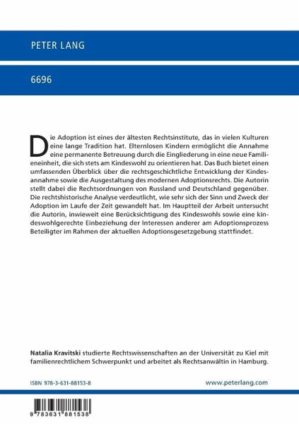 Die Adoption ist eines der ältesten Rechtsinstitute, das in vielen Kulturen eine lange Tradition hat. Elternlosen Kindern ermöglicht die Annahme eine permanente Betreuung durch die Eingliederung in eine neue Familieneinheit, die sich stets am Kindeswohl zu orientieren hat. Das Buch bietet einen umfassenden Überblick über die rechtsgeschichtliche Entwicklung der Kindesannahme sowie die Ausgestaltung des modernen Adoptionsrechts. Die Autorin stellt dabei die Rechtsordnungen von Russland und Deutschland gegenüber. Die rechtshistorische Analyse verdeutlicht, wie sehr sich der Sinn und Zweck der Adoption im Laufe der Zeit gewandelt hat. Im Hauptteil der Arbeit untersucht die Autorin, inwieweit eine Berücksichtigung des Kindeswohls sowie eine kindeswohlgerechte Einbeziehung der Interessen anderer am Adoptionsprozess Beteiligter im Rahmen der aktuellen Adoptionsgesetzgebung stattfindet.