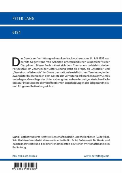 Das Gesetz zur Verhütung erbkranken Nachwuchses vom 14. Juli 1933 war bereits Gegenstand von Arbeiten unterschiedlicher wissenschaftlicher Disziplinen. Dieses Buch nähert sich dem Thema aus rechtshistorischer Perspektive. Im Zentrum der Untersuchung steht die Frage, ob «Asoziale» und «Gemeinschaftsfremde» im Sinne der nationalsozialistischen Terminologie der Zwangssterilisierung nach dem Gesetz zur Verhütung erbkranken Nachwuchses unterlagen. Grundlage der Untersuchung sind neben der zeitgenössischen Fachliteratur insbesondere die veröffentlichten Entscheidungen der Erbgesundheits- und Erbgesundheitsobergerichte.