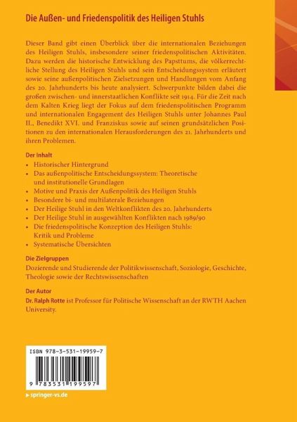Dieser Band gibt einen Überblick über die internationalen Beziehungen des Heiligen Stuhls, insbesondere seiner friedenspolitischen Aktivitäten. Dazu werden die historische Entwicklung des Papsttums, die völkerrechtliche Stellung des Heiligen Stuhls und sein Entscheidungssystem erläutert sowie seine außenpolitischen Zielsetzungen und Handlungen vom Anfang des 20. Jahrhunderts bis heute analysiert. Schwerpunkte bilden dabei die großen zwischen- und innerstaatlichen Konflikte seit 1914. Für die Zeit nach dem Kalten Krieg liegt der Fokus auf dem friedenspolitischen Programm und internationalen Engagement des Heiligen Stuhls unter Johannes Paul II., Benedikt XVI. und Franziskus sowie auf seinen grundsätzlichen Positionen zu den internationalen Herausforderungen des 21. Jahrhunderts und ihren Problemen.