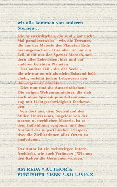Dieser Roman erzählt aus dem bewegten Leben des Autors; mithin auch dem Wissen aller relevanten Begebenheiten großer Persönlichkeiten, die es so an sich haben, gelegentlich aus der Schule zu plaudern, gut gestimmt sind, wenn sie ihresgleichen erkennen und ihm Vertrauen schenkt. Dies nun ist der Clou in diesem Roman: Die Seele, die nicht ein Produckt der Materie, wie etwa unserem Planeten ERDE; alles m. Leben das darauf - im Zusammenwirken von Sonnenenergie, etc. im Zuge der Evolution entstanden - über Vater, Mutter auch: Aber o weh, was war passiert? Mit dem einen und der anderen, da verstehen sich beide Elternteile bestens; nur mit dem Dritten nicht. Sie sehen sich zwar ein wenig ähnlich, dennoch hat er andere Vorstellungen von gewissen Dinge, ganz anders als die anderen Geschwister, selbst der Eltern... Eben, da scheiden sich die Geister: so wie dieser Planet auf seinem Weg um seinen Fixstern das unsichtbare Universum durcheilt, weil zur selben Zeit Menschen in Kopulation verharren, die Seele jener Universumsregion sich mit den Liebenden verbinden muß, ob es will oder nicht. Hier also, und mit "point of conzeption" wurde die, der Ausserirdische geboren, um nach rund neun Monaten vom Mutterleib auf ERDEN entbunden zu werden. Unter SONNE; MOND und STERNE; nehmt dieser Roman Anleihe bei den KELTEN, und deren Baumhoroskop, auch als Keltenkalender bekannt geworden - weil dieser in der Hauptsache die Charaktereigenschaften der Bäume, wie der Menschen im selben Zeitraum geboren - seine um 180° GEGENÜBER...