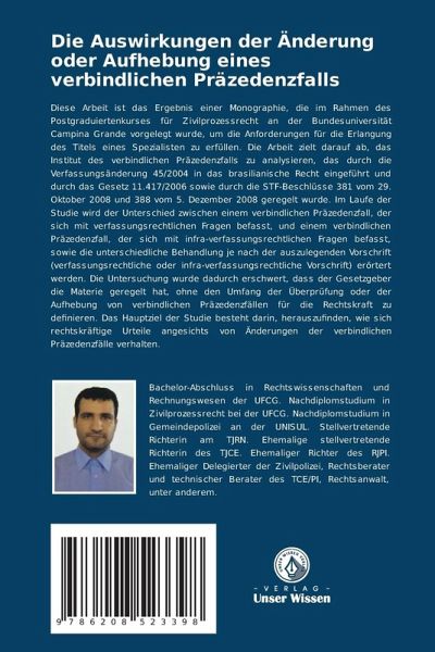 Diese Arbeit ist das Ergebnis einer Monographie, die im Rahmen des Postgraduiertenkurses für Zivilprozessrecht an der Bundesuniversität Campina Grande vorgelegt wurde, um die Anforderungen für die Erlangung des Titels eines Spezialisten zu erfüllen. Die Arbeit zielt darauf ab, das Institut des verbindlichen Präzedenzfalls zu analysieren, das durch die Verfassungsänderung 45/2004 in das brasilianische Recht eingeführt und durch das Gesetz 11.417/2006 sowie durch die STF-Beschlüsse 381 vom 29. Oktober 2008 und 388 vom 5. Dezember 2008 geregelt wurde. Im Laufe der Studie wird der Unterschied zwischen einem verbindlichen Präzedenzfall, der sich mit verfassungsrechtlichen Fragen befasst, und einem verbindlichen Präzedenzfall, der sich mit infra-verfassungsrechtlichen Fragen befasst, sowie die unterschiedliche Behandlung je nach der auszulegenden Vorschrift (verfassungsrechtliche oder infra-verfassungsrechtliche Vorschrift) erörtert werden. Die Untersuchung wurde dadurch erschwert, dass der Gesetzgeber die Materie geregelt hat, ohne den Umfang der Überprüfung oder der Aufhebung von verbindlichen Präzedenzfällen für die Rechtskraft zu definieren. Das Hauptziel der Studie besteht darin, herauszufinden, wie sich rechtskräftige Urteile angesichts von Änderungen der verbindlichen Präzedenzfälle verhalten.