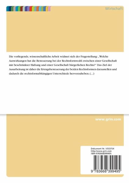 Bachelorarbeit aus dem Jahr 2014 im Fachbereich BWL - Rechnungswesen, Bilanzierung, Steuern, Note: 2,3, Rheinische Fachhochschule Köln, Sprache: Deutsch, Abstract: Die vorliegende, wissenschaftliche Arbeit widmet sich der Fragestellung: "Welche Auswirkungen hat die Besteuerung bei der Rechtsformwahl zwischen einer Gesellschaft mit beschränkter Haftung und einer Gesellschaft bürgerlichen Rechts?"Das Ziel der Ausarbeitung ist daher die Ertragsbesteuerung der beiden Rechtsformen darzustellen und dadurch die rechtsformabhängigen Unterschiede hervorzuheben. Zudem soll zwei potentiellen Unternehmensgründern eine steuerliche Entscheidungshilfe bezüglich ihrer Rechtsformwahl zwischen einer Gesellschaft mit beschränkter Haftung und einer Gesellschaft bürgerlichen Rechts gegeben werden, bei der unterschiedliche Gewinnverwendungen zu berücksichtigen sind. Anhand eines Steuerbelastungsvergleiches im Fall der Ausschüttung des Unternehmensgewinns ist die Handlungsempfehlung zahlenmäßig zu belegen. Dabei ist sowohl die Besteuerung der Gesellschafts-, als auch der Gesellschafterebene darzustellen und zu analysieren. Die gesellschaftsrechtlichen Kriterien der Rechtsformwahl werden aufgeführt und erläutert, jedoch werden sie im analytischen Teil der Ausarbeitung nicht berücksichtigt, da dies über den Rahmen der wissenschaftlichen Arbeit hinausgehen würde. Zudem wird sich ausschließlich mit der laufenden Besteuerung der Gesellschaft mit beschränkter Haftung und der Gesellschaft bürgerlichen Rechts befasst.