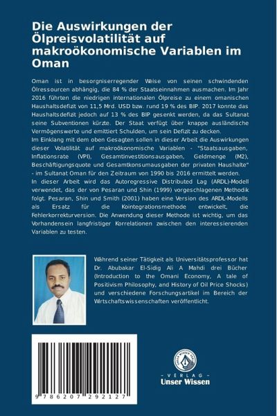 Oman ist in besorgniserregender Weise von seinen schwindenden Ölressourcen abhängig, die 84 % der Staatseinnahmen ausmachen. Im Jahr 2016 führten die niedrigen internationalen Ölpreise zu einem omanischen Haushaltsdefizit von 11,5 Mrd. USD bzw. rund 19 % des BIP. 2017 konnte das Haushaltsdefizit jedoch auf 13 % des BIP gesenkt werden, da das Sultanat seine Subventionen kürzte. Der Staat verfügt über knappe ausländische Vermögenswerte und emittiert Schulden, um sein Defizit zu decken. Im Einklang mit dem oben Gesagten sollen in dieser Arbeit die Auswirkungen dieser Volatilität auf makroökonomische Variablen - "Staatsausgaben, Inflationsrate (VPI), Gesamtinvestitionsausgaben, Geldmenge (M2), Beschäftigungsquote und Gesamtkonsumausgaben der privaten Haushalte" - im Sultanat Oman für den Zeitraum von 1990 bis 2016 ermittelt werden.In dieser Arbeit wird das Autoregressive Distributed Lag (ARDL)-Modell verwendet, das der von Pesaran und Shin (1999) vorgeschlagenen Methodik folgt. Pesaran, Shin und Smith (2001) haben eine Version des ARDL-Modells als Ersatz für die Kointegrationsmethode entwickelt, die Fehlerkorrekturversion. Die Anwendung dieser Methode ist wichtig, um das Vorhandensein langfristiger Korrelationen zwischen den interessierenden Variablen zu testen.