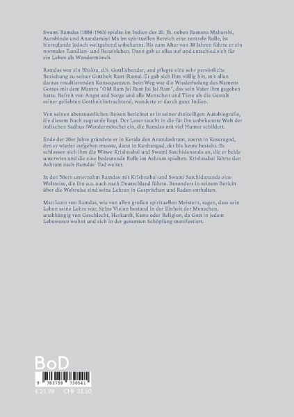 Swami Ramdas (1884-1963) spielte im Indien des 20. Jh. neben Ramana Maharshi, Aurobindo und Anandamayi Ma im spirituellen Bereich eine zentrale Rolle, ist hierzulande jedoch weitgehend unbekannt. Bis zum Alter von 38 führte er ein normales Familien- und Berufsleben. Dann gab er alles auf und entschied sich für ein Leben als Wandermönch.Er war ein Bhakta, d.h. Gottliebender, und pflegte eine sehr persönliche Beziehung zu seiner Gottheit Ram (Rama). Er gab sich Ihm völlig hin, mit allen daraus resultierenden Konsequenzen. Sein Weg war die Wiederholung des Namens Gottes mit dem Mantra "OM Ram Jai Ram Jai Jai Ram", das sein Vater ihm gegeben hatte. Befreit von Angst und Sorge und alle Menschen und Tiere als die Gestalt seiner geliebten Gottheit betrachtend, wanderte er durch ganz Indien. Von seinen abenteuerlichen Reisen berichtet er in seiner dreiteiligen Autobiografie, die diesem Buch zugrunde liegt. Der Leser taucht in die für ihn unbekannte Welt der indischen Sadhus (Wandermönche) ein, die Ramdas mit viel Humor schildert.Ende der 20er Jahre gründete er in Kerala den Anandashram, zuerst in Kasaragod, den er wieder aufgeben musste, dann in Kanhangad, der bis heute besteht. Es schlossen sich ihm die Witwe Krishnabai und Swami Satchidananda an, die er beide unterwies und die eine bedeutende Rolle im Ashram spielten. Krishnabai führte den Ashram nach Ramdas' Tod weiter.In den 50ern unternahm Ramdas mit Krishnabai und Swami Satchidananda eine Weltreise, die ihn u.a. auch nach Deutschland führte. Besonders in seinem Bericht über die Weltreise sind seine Lehren in Gesprächen und Reden enthalten. Man kann von Ramdas, wie von allen großen spirituellen Meistern, sagen, dass sein Leben seine Lehre war. Seine Vision bestand in der Einheit der Menschen, unabhängig von Geschlecht, Herkunft, Kaste oder Religion, da Gott in jedem Lebewesen wohnt und sich in der gesamten Schöpfung manifestiert.