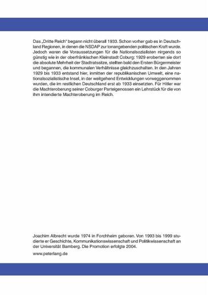 Das "Dritte Reich" begann nicht überall 1933. Schon vorher gab es in Deutschland Regionen, in denen die NSDAP zur tonangebenden politischen Kraft wurde. Jedoch waren die Voraussetzungen für die Nationalsozialisten nirgends so günstig wie in der oberfränkischen Kleinstadt Coburg: 1929 eroberten sie dort die absolute Mehrheit der Stadtratssitze, stellten bald den Ersten Bürgermeister und begannen, die kommunalen Verhältnisse gleichzuschalten. In den Jahren 1929 bis 1933 entstand hier, inmitten der republikanischen Umwelt, eine nationalsozialistische Insel, in der weitgehend Entwicklungen vorweggenommen wurden, die im restlichen Deutschland erst ab 1933 einsetzten. Für Hitler war die Machteroberung seiner Coburger Parteigenossen ein Lehrstück für die von ihm intendierte Machteroberung im Reich.