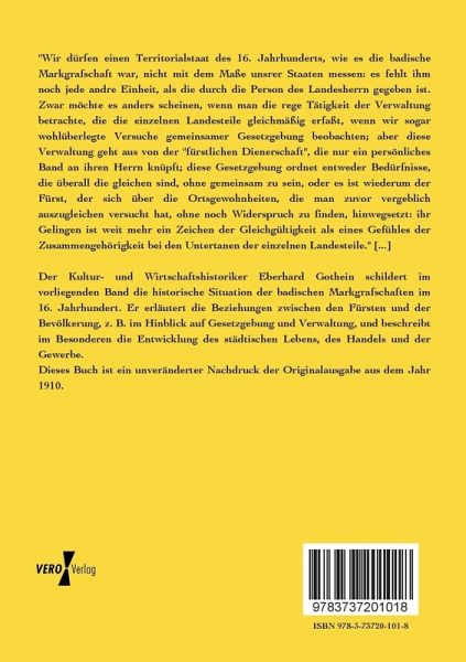 Der Kultur- und Wirtschaftshistoriker Eberhard Gothein schildert im vorliegenden Band die historische Situation der badischen Markgrafschaften im 16. Jahrhundert. Er erläutert die Beziehungen zwischen den Fürsten und der Bevölkerung, z. B. im Hinblick auf Gesetzgebung und Verwaltung, und beschreibt im Besonderen die Entwicklung des städtischen Lebens, des Handels und der Gewerbe.