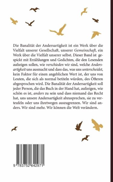 Die Banalität der Andersartigkeit ist ein Werk über die Vielfalt unserer Gesellschaft, unserer Gemeinschaft, ein Werk über die Vielfalt unserer selbst. Dieser Band ist gespickt mit Erzählungen und Gedichten, die den Lesenden aufzeigen sollen, wie verschieden wir sind, welche Andersartigkeit uns ausmacht und dass das, was uns unterscheidet, kein Faktor für einen angeblichen Wert ist, der uns von Leuten, die sich als normal betiteln würden, des Öfteren abgesprochen wird. Die Banalität der Andersartigkeit soll jeder Person, die das Buch in der Hand hat, aufzeigen, wie schön es ist, anders zu sein und dass niemand das Recht hat, uns unsere Andersartigkeit abzusprechen, sie zu verteufeln oder uns ihretwegen auszugrenzen. Wir sind anders. Wir sind mehr. Wir können die Welt verändern.