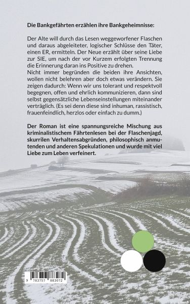 Sensibel, einfühlsam und lebensweise... mit einer großen Portion Skurrilität Die Bankgefährten enthüllen ihre Bankgeheimnisse: Der Alte kombiniert Flaschenfunde zu logischen Schlüssen und jagt dabei einen mysteriösen Täter. Der Neue ergründet seine Liebe zu SIE, um nach einer jüngsten Trennung positive Erinnerungen zu schaffen. Nicht immer begründen die beiden ihre Ansichten, möchten nicht belehren, sondern Veränderung anregen. Ein Plädoyer: Toleranz und respektvolle Kommunikation machen selbst gegensätzliche Lebensansichten miteinander verträglich, außer sie sind inhuman, rassistisch, frauenfeindlich, herzlos oder schlicht dumm.Dieser Roman verwebt kriminalistisches Fährtenlesen, skurrile Verhaltensabgründe und philosophische Spekulationen zu einer spannenden Mischung - eine künstlerische Ode an das Leben.