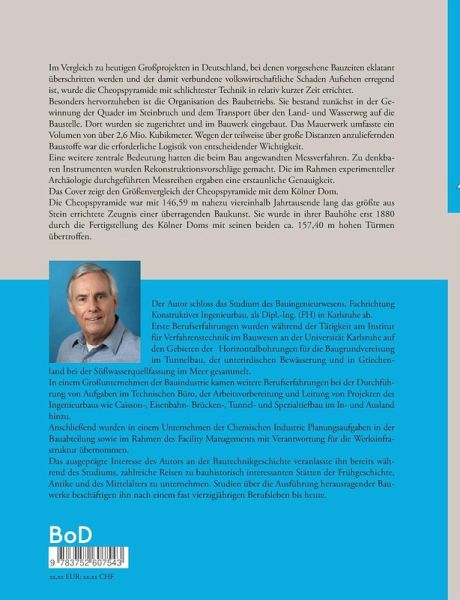 Viele Fragen über den Pyramidenbau sind bis heute noch immer nicht beantwortet. Bisherige Veröffentlichungen beschrieben zwar vielfältige Methoden, jedoch wurden bisher keine schlüssigen und überzeugenden Antworten darauf gegeben, wie sie errichtet wurden.Als Bauingenieur habe ich mir die Aufgabe gestellt, die als fast unlösbar geltenden technischen Rätsel umfassend und widerspruchsfrei zu klären.Durch meine jahrzehntelange Berufserfahrung und ausführlichen Recherchen kann ich bisher veröffentlichte Darlegungen mit neuem praxisnahem Wissen erweitern und wissenschaftlich fundiert berichtigen. Über den Pyramidenbau gibt es weder schriftliche noch bildliche Aufzeichnungen. Bautechniken konnten nur anhand von archäologisch nachgewiesenen Werkzeugen und Geräten sowie vor Ort durchgeführten Untersuchungen der Konstruktionen und Bearbeitungsspuren am Beispiel der Cheopspyramide erforscht werden.Das zur Errichtung dieses gewaltigen Monuments erforderliche Erfahrungswissen wurde von den Erbauern durch Versuch und Irrtum gewonnen und von immer währendem Wagnis begleitet.Es wird allgemein angenommen, dass die Errichtung der Cheopspyramide mit einem Volumen von 2,6 Mio. m³ Quadermauerwerk innerhalb von 23 Jahren erfolgte, was der Regierungszeit des König Cheops entspricht. Weil Grabmonumente im Alten Ägypten unmittelbar nach der Thronbesteigung eines Königs beauftragt wurden und bis zu seinem Tod fertiggestellt sein mussten, standen die Bauabläufe von Anfang an unter unbestimmtem Zeitdruck. Weil zur Bauzeit noch keine Hebezeuge bekannt waren, kam für die gewaltigen Quadermassen und die bis zu 70 Tonnen schweren Steinbalken nur der Transport auf Holzschlitten in Betracht.Messtechnisch war es eine besondere Herausforderung, dass sich die vier aufsteigenden Kanten der Pyramide über einem Grundrissquadrat mit 230 m Seitenlänge in 147 m Höhe in einem Punkt trafen.Den glaubwürdigen Beweis, dass die Cheopspyramide in der kurzen Bauzeit zu realisieren war, bilden die durchgeführten belastbaren Nachweise und Leistungsberechnungen.Bei heutigen Großprojekten werden in Deutschland häufig die vorgesehenen Bauzeiten eklatant überschritten. Im Gegensatz dazu wurde die Cheopspyramide in relativ kurzer Zeit errichtet.Die in meiner Publikation dargelegten Erkenntnisse geben überraschende und spannende Einblicke in die großartige Technikgeschichte des Pyramidenbaus. Sie sollen nicht nur das Fachpublikum ansprechen, sondern auch die interessierte Öffentlichkeit.