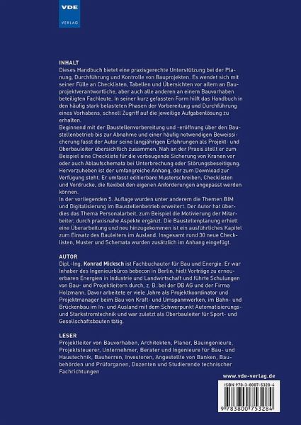 Dieses Handbuch bietet eine praxisgerechte Unterstützung bei der Planung, Durchführung und Kontrolle von Bauprojekten. Es wendet sich mit seiner Fülle an Checklisten, Tabellen und Übersichten vor allem an Bauprojektverantwortliche, aber auch alle anderen an einem Bauvorhaben beteiligten Fachleute. In seiner kurz gefassten Form hilft das Handbuch in den häufig stark belasteten Phasen der Vorbereitung und Durchführung eines Vorhabens, schnell Zugriff auf die jeweilige Aufgabenlösung zu erhalten.Beginnend mit der Baustellenvorbereitung und -eröffnung über den Baustellenbetrieb bis zur Abnahme und einer häufig notwendigen Beweissicherung fasst der Autor seine langjährigen Erfahrungen als Projekt- und Oberbauleiter übersichtlich zusammen. Nah an der Praxis stellt er zum Beispiel eine Checkliste für die vorbeugende Sicherung von Kranen vor oder auch Ablaufschemata bei Unterbrechung oder Störungsbeseitigung.Hervorzuheben ist der umfangreiche Anhang, der zum Download zur Verfügung steht.Er umfasst editierbare Musterschreiben, Checklisten und Vordrucke, die flexibel den eigenen Anforderungen angepasst werden können.In der vorliegenden 5. Auflage wurden unter anderem die Themen BIM und Digitalisierung im Baustellenbetrieb erweitert. Der Autor hat überdies das Thema Personalarbeit, zum Beispiel die Motivierung der Mitarbeiter, durch praxisnahe Aspekte ergänzt. Die Baustellenplanung erhielt eine Überarbeitung und neu hinzugekommen ist ein ausführliches Kapitel zum Einsatz des Bauleiters im Ausland. Insgesamt rund 30 neue Checklisten, Muster und Schemata wurden zusätzlich im Anhang eingefügt.