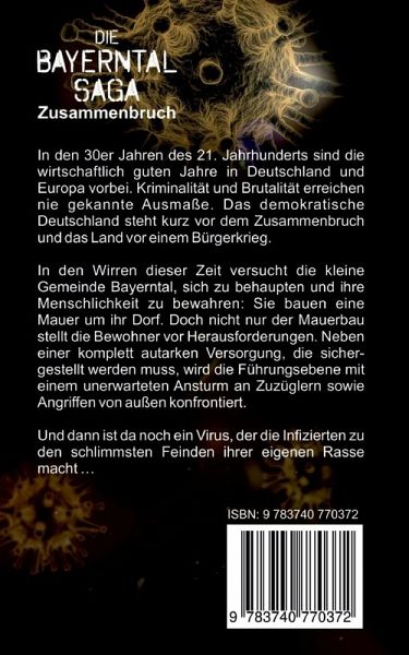 In den 30er Jahren des 21. Jahrhunderts sind die wirtschaftlich guten Jahre in Deutschland und Europa vorbei. Kriminalität und Brutalität erreichen nie gekannte Ausmaße. Das demokratische Deutschland steht kurz vor dem Zusammenbruch und das Land vor einem Bürgerkrieg. In den Wirren dieser Zeit versucht die kleine Gemeinde Bayerntal, sich zu behaupten und seine Menschlichkeit zu bewahren. Sie bauen eine Mauer um ihr Dorf. Doch nicht nur der Mauerbau stellt die Bewohner vor Herausforderungen. Neben einer komplett autarken Versorgung, die sichergestellt werden muss, wird die Führungsebene mit einem unerwarteten Ansturm an Zuzüglern sowie Angriffen von außen konfrontiert. Und dann ist da noch ein Virus, der die Menschen zu den schlimmsten Feinden ihrer eigenen Rasse macht .