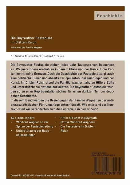 Fachbuch aus dem Jahr 2013 im Fachbereich Geschichte Europa - Deutschland - Nationalsozialismus, II. Weltkrieg, , Sprache: Deutsch, Abstract: Die Bayreuther Festspiele ziehen jedes Jahr Tausende von Besuchern an. Wagners Opern erstrahlen in neuem Glanz und der Run auf die Karten kennt keine Grenzen. Doch die Geschichte der Festspiele zeigt auch eine politische Dimension abseits der opulenten Inszenierungen und der Kunst. Im Dritten Reich stand die Familie Wagner nahe an Hitlers Seite und unterstützte die Nationalsozialisten. Die Bayreuther Festspiele wurden so zu einer Repräsentationsbühne für einen dunklen Teil der deutschen Geschichte.In diesem Band werden die Beziehungen der Familie Wagner zu der nationalsozialistischen Führungsriege entschlüsselt. Wie entstand der Kontakt? Und wie veränderten sich die Festspiele in dieser Zeit?Aus dem Inhalt: Winifred Wagner an der Spitze der Festspielleitung, Unterstützung der Nationalsozialisten, Hitler als Gast in Bayreuth, Motive WinifredWagners, die Festspiele im Dritten Reich.