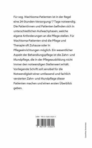 Ein Aspekt der Behandlungspflege von sog. Wachkoma-Patienten ist die Zahn- und Mundpflege, die in der Pflegeausbildung oft zu kurz kommt. Vorliegende Schrift macht die Notwendigkeit einer fachlich versierten Zahn- und Mund-pflege dieser Patienten deutlich.