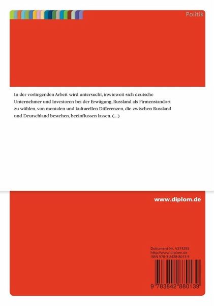 Doktorarbeit / Dissertation aus dem Jahr 2012 im Fachbereich Politik - Internationale Politik - Region: Russland, Länder der ehemal. Sowjetunion, Universität Vechta; früher Hochschule Vechta (Institut für Sozialwissenschaften und Philosophie (ISP)), Sprache: Deutsch, Anmerkungen: Dissertation zur Erlangung der Doktorwürde der Politik- und Sozialwissenschaftlichen Fakultät des Instituts für Sozialwissenschaften und Philosophie (ISP) der Universität Vechta , Abstract: In der vorliegenden Arbeit wird untersucht, inwieweit sich deutsche Unternehmer und Investoren bei der Erwägung, Russland als Firmenstandort zu wählen, von mentalen und kulturellen Differenzen, die zwischen Russland und Deutschland bestehen, beeinflussen lassen.