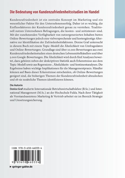 Kundenzufriedenheit ist ein zentrales Konzept im Marketing und ein wesentlicher Faktor für den Unternehmenserfolg. Daher ist es wichtig, die Einflussfaktoren der Kundenzufriedenheit genau zu verstehen. Traditionell nutzen Unternehmen Befragungen, die kosten- und zeitintensiv sind. Mit der zunehmenden Verfügbarkeit von nutzergenerierten Inhalten bieten Online-Bewertungen jedoch eine vielversprechende und kostengünstige Alternative zur Identifikation der Zufriedenheitsfaktoren. Denise Graf untersucht in diesem Buch mit einem Topic-Modell die Ähnlichkeit von Umfragedaten und Online-Bewertungen. Grundlage sind über 10.000 Bewertungen aus zwei Kundenzufriedenheitsstudien eines deutschen Lebensmittelhändlers und über 5.000 Google-Bewertungen. Die Ähnlichkeit wird durch fünf Analysen bewertet, dazu gehören neben der deskriptiven Statistik auch Erkenntnisse aus dem Topic-Modell sowie aus Regressions-, Ähnlichkeits- und Sentimentanalysen. Die Ergebnisse haben wichtige Implikationen für die Managementpraxis. Händler können auf Basis dieser Erkenntnisse entscheiden, ob Online-Bewertungen geeignet sind, die bisherigen Themen der Kundenzufriedenheit abzudecken und ob sie zusätzliche Themen identifizieren können.