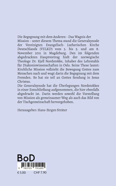 Die Begegnung mit dem Anderen - Das Wagnis der Mission - unter diesem Thema stand die Generalsynode der Vereinigten Evangelisch-Lutherischen Kirche Deutschlands (VELKD) vom 3. bis 5. und am 8. November 2011 in Magdeburg. Den im folgenden abgedruckten Hauptvortrag hielt der norwegische Theologe Dr. Kjell Nordstokke, Inhaber des Lehrstuhls für Diakoniewissenschaften in Oslo. Seine These lautet: Kirchliche Mission vollzieht die Bewegung Gottes zum Menschen nach und wagt darin die Begegnung mit dem Fremden. So hat sie teil an Gottes Sendung in Jesus Christus. Die Generalsynode hat die Überlegungen Nordstokkes in einer Entschließung aufgenommen, die hier ebenfalls abgedruckt ist. Darin werden sowohl die Vorstellung von Mission als gemeinsamer Weg als auch das Bild von der Tischgemeinschaft hervorgehoben. Herausgeber: Hans-Jürgen Sträter, Adlerstein Verlag