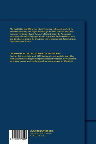 Die vorliegende Studie beschäftigt sich mit den kategorialen Begriffen von Realität und Wirklichkeit innerhalb der historischen Diskussionsstadien um 1800. Die Autorin liefert dabei jenseits des Dualismus von Idealismus und Realismus eine Begründung des Realen innerhalb ihrer Vermittlung. Sie fragt danach, wie wir um diese Vermittlung wissen können, und erkundet anhand der Hegelschen Wesenslogik in kritischer Absetzung zu dessen Vorläufern (Kant, Jacobi, Fichte) die argumentative Basis dafür, welche kategorialen Grundbedingungen ein Begriff von Realität erfüllen muss: nämlich Realität immer schon als immanent verbunden mit einer bestimmten Art von fundamentaler Begrifflichkeit zu verstehen.