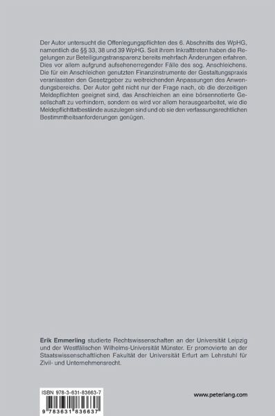 Der Autor untersucht die Offenlegungspflichten des 6. Abschnitts des WpHG, namentlich die §§ 33, 38 und 39 WpHG. Seit ihrem Inkrafttreten haben die Regelungen zur Beteiligungstransparenz bereits mehrfach Änderungen erfahren. Dies vor allem aufgrund aufsehenerregender Fälle des sog. Anschleichens. Die für ein Anschleichen genutzten Finanzinstrumente der Gestaltungspraxis veranlassten den Gesetzgeber zu weitreichenden Anpassungen des Anwendungsbereichs. Der Autor geht nicht nur der Frage nach, ob die derzeitigen Meldepflichten geeignet sind, das Anschleichen an eine börsennotierte Gesellschaft zu verhindern, sondern es wird vor allem herausgearbeitet, wie die Meldepflichttatbestände auszulegen sind und ob sie den verfassungsrechtlichen Bestimmtheitsanforderungen genügen.