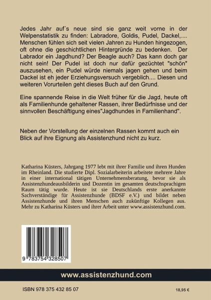 Jedes Jahr auf´s Neue sind sie ganz weit vorne in der Welpenstatistik zu finden: Labradore, Golden Retriever, Pudel, Dackel.... Viele Menschen fühlen sich seit Jahren zu diesen Hunden hingezogen, oft ohne die geschichtlichen Hintergründe zu bedenken. Der Labrador ein Jagdhund? Der Beagle auch? Das kann doch gar nicht sein! Der Pudel ist doch nur dafür gezüchtet "schön" auszusehen, ein Pudel würde niemals jagen gehen und beim Dackel ist eh jeder Erziehungsversuch vergeblich.... Diesen und weiteren Vorurteilen geht ddas Buch auf den Grund. Eine spannende Reise in die Welt früher für die Jagd, heute oft als Familienhunde gehaltener Rassen, ihrer Bedürfnisse und der sinnvollen Beschäftigung eines"Jagdhundes in Familienhand". Neben der Vorstellung der einzelnen Rassen kommt auch ein Blick auf ihre Eignung als Assistenzhund nicht zu kurz. Eine spannende Reise in die Welt früher für die Jagd, heute oft als Familienhunde gehaltener Rassen, ihrer Bedürfnisse und der sinnvollen Beschäftigung eines "Jagdhundes in Familienhand". Neben der Vorstellung der einzelnen Rassen kommt auch ein Blick auf ihre Eignung als Assistenzhund nicht zu kurz.
