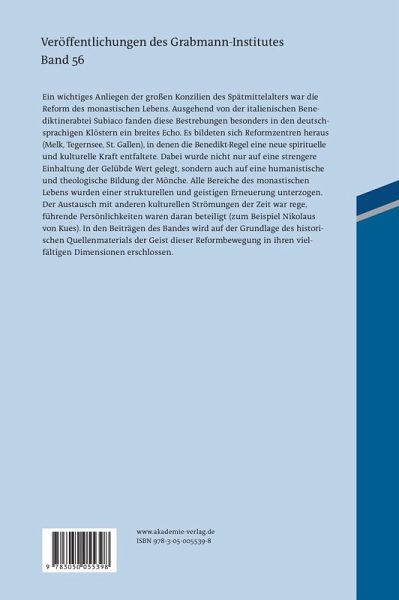 Ein wichtiges Anliegen der großen Konzilien des Spätmittelalters war die Reform des monasti-schen Lebens. Ausgehend von der italienischen Benediktinerabtei Subiaco fanden diese Bestrebun-gen besonders in den deutschsprachigen Klöstern ein breites Echo. Es bildeten sich Reformzentren heraus (Melk, Tegernsee, St. Gallen), in denen die Benedikt-Regel eine neue spirituelle und kultu-relle Kraft entfaltete. Dabei wurde nicht nur auf eine strengere Einhaltung der Gelübde Wert gelegt, sondern auch auf eine humanistische und theologische Bildung der Mönche. Alle Bereiche des mo-nastischen Lebens wurden einer strukturellen und geistigen Erneuerung unterzogen. Der Austausch mit anderen kulturellen Strömungen der Zeit war rege, führende Persönlichkeiten waren daran be-teiligt (zum Beispiel Nikolaus von Kues). In den Beiträgen des Bandes wird auf der Grundlage des historischen Quellenmaterials der Geist dieser Reformbewegung in ihren vielfältigen Dimensionen erschlossen.