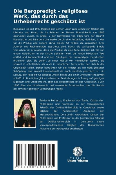 Rumänien ist seit 1927 Mitglied der Berner Union zum Schutz von Werken der Literatur und Kunst, die im Rahmen der Berner Übereinkunft von 1886 gegründet wurde. In Artikel 2 der Konvention von 1886 wird der Begriff literarische und künstlerische Werke durch eine Aufzählung definiert, in der wir die Predigt und andere Werke dieser Art finden, die zugunsten ihrer Autoren und Rechteinhaber geschützt sind. Durch die vorliegende Studie versuchen wir zu zeigen, dass die Predigt als eine Rede definiert ist, die von einem Geistlichen in der Kirche gehalten wird, der einen biblischen Text erklärt und kommentiert und den Gläubigen die notwendigen moralischen Richtlinien gibt. Sie gehört zu einer Klasse von mündlichen Werken, die sowohl in schriftlicher als auch in mündlicher Form unter den Schutz der Originalität fallen. Daher betrachten wir die Predigt als ein Werk geistiger Schöpfung, das sowohl konventionell als auch rechtlich geschützt ist, ein Schutz, der Respekt für geistige Arbeit bietet und einen Anreiz für Kreativität schafft. In Rumänien gibt es zahlreiche Bestrebungen in Bezug auf geistiges Eigentum und Urheberrecht, aber das eloquenteste ist das Gesetz Nr. 8 von 1996 über das Urheberrecht und verwandte Schutzrechte, das die Rechte der Urheber geistiger Schöpfungen regelt.