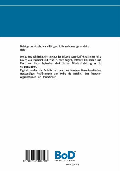 Dieses Heft beinhaltet die Berichte der Brigade Burgsdorff (Regimenter Prinz Xavier, von Thümmel und Prinz Friedrich August, Batterien Haußmann und Ernst) von Ende September 1806 bis zur Wiedereinrückung in die Standquartiere. Ergänzt werden die Berichte mit den zum besseren Gesamtverständnis notwendigen Ausführungen zur Ordre de Bataille, den Truppenorganisationen und -formationen.
