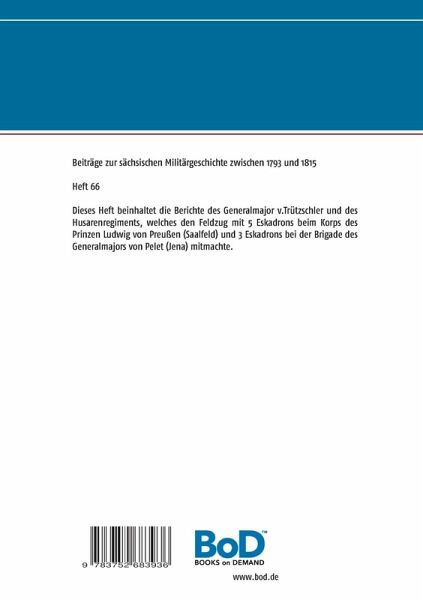 Dieses Heft beinhaltet die Berichte des Generalmajor v.Trützschler und des Husarenregiments, welches den Feldzug mit 5 Eskadrons beim Korps des Prinzen Ludwig von Preußen (Saalfeld) und 3 Eskadrons bei der Brigade des Generalmajors von Pelet (Jena) mitmachte.