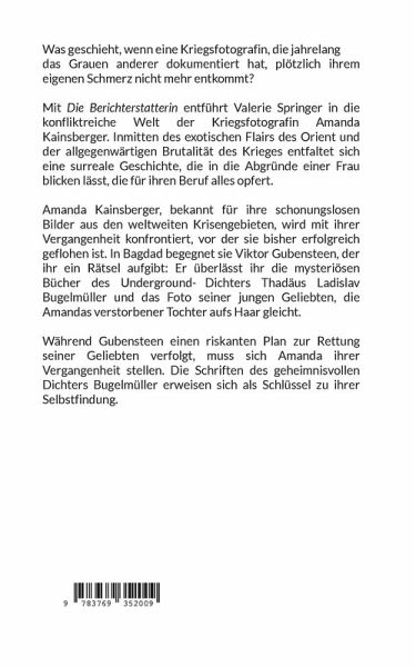 Was geschieht, wenn eine Kriegsfotografin, die jahrelang das Grauen anderer dokumentiert hat, plötzlich ihrem eigenen Schmerz nicht mehr entkommt? Mit Die Berichterstatterin entführt Valerie Springer in die konfliktreiche Welt der Kriegsfotografin Amanda Kainsberger. Inmitten des exotischen Flairs des Orient und der allgegenwärtigen Brutalität des Krieges entfaltet sich eine surreale Geschichte, die in die Abgründe einer Frau blicken lässt, die für ihren Beruf alles opfert. Amanda Kainsberger, bekannt für ihre schonungslosen Bilder aus den weltweiten Krisengebieten, wird mit ihrer Vergangenheit konfrontiert, vor der sie bisher erfolgreich geflohen ist. In Bagdad begegnet sie Viktor Gubensteen, der ihr ein Rätsel aufgibt: Er überlässt ihr die mysteriösen Bücher des Underground-Dichters Thadäus Ladislav Bugelmüller und das Foto seiner jungen Geliebten, die Amandas verstorbener Tochter aufs Haar gleicht. Während Gubensteen einen riskanten Plan zur Rettung seiner Geliebten verfolgt, muss sich Amanda ihrer Vergangenheit stellen. Die Schriften des geheimnisvollen Dichters Bugelmüller erweisen sich als Schlüssel zu ihrer Selbstfindung.