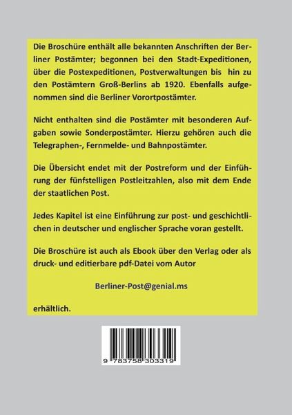 Die Broschüre enthält alle bekannten Anschriften der Berliner Postämter; begonnen bei den Stadtpost-Expeditionen, über die Postexpeditionen, Postverwaltungen bis hin zu den Postämtern Groß-Berlins ab 1920. Ebenfalls aufgenommen sind die Berliner Vorortpostämter. Die Einleitungen der einzelnen Kapitel sind in Deutsch und Englisch verfasst.Nicht enthalten sind die Postämter mit besonderen Aufgaben oder die nur kurzzeitig bestanden sowie Sonderpostämter. Hierzu gehören auch die Telegraphen-, Fernmelde- und Bahnpostämter. Die Übersicht endet mit der Postreform und der Einführung der fünfstelligen Postleitzahlen, also mit dem Ende der staatlichen Post. Für die Zeit nach dem 1. Juli 1993 sind die neuen Postleitzahlen und ggf. das endgültige Schließdatum angegeben. Die Postfilialen im Einzelhandel ab 1994 wurden nicht aufgenommen.Durch die Einleitung zu den einzelnen Kapiteln in deutscher und englischer Sprache ist es nicht nur ein postgeschichtliches Buch, sondern spiegelt auch die gesellschaftlichen Veränderungen in und um Berlin (von der Gründung des Kommunalen Zweckverbandes 1912, der Schaffung Groß-Berlins 1920 und der Teilung der Stadt nach 1945) sowie der Wiedervereinigung 1990 wieder.