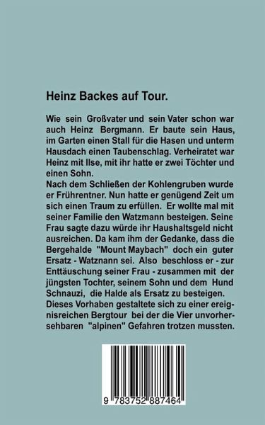 Heinz Backes war Saarländer. Wie sein Großvater und sein Vater schon, war er Bergmann. Er baute sein Haus, im Garten einen Stall für die Hasen und unterm Hausdach einen Taubenschlag. Verheiratet war Heinz mit Ilse, mit ihr zusammen hatte er zwei Töchter und einen Sohn. Nach dem Schließen der Kohlengruben wurde er Frührentner. Nun hatte er genügend Zeit, um sich einen Traum zu erfüllen. Er wollte mal mit seiner Familie den Watzmann in den Alpen besteigen. Seine Frau sagte, dazu würde ihr Haushaltsgeld nicht ausreichen. Da kam ihm der Gedanke, dass die Bergehalde "Mount Maybach" doch ein guter Ersatz-Watzmann sei. Also beschloss er - zur Enttäuschung seiner Frau - zusammen mit der jüngeren Tochter, seinem Sohn und dem Hund Schnauzi, die Halde als Ersatz zu besteigen. Dieses Vorhaben gestaltete sich zu einer ereignisreichen Begtour, bei der die vier unvorhersehbaren "alpinen" Gefahren trotzen mussten.