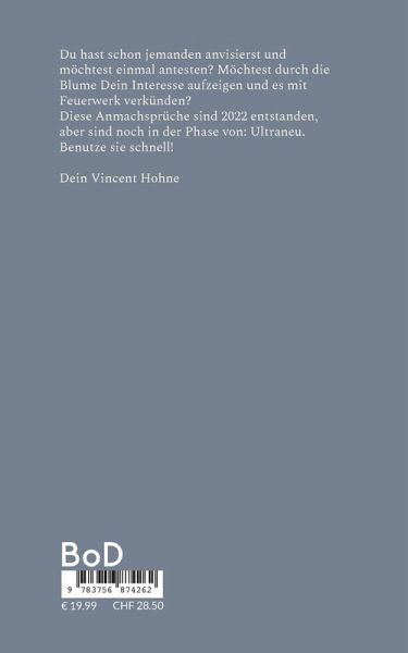Du hast schon jemanden anvisierst und möchtest einmal antesten? Möchtest durch die Blume Dein Interesse aufzeigen und es mit Feuerwerk verkünden?Diese Anmachsprüche sind 2022 entstanden, aber sind noch in der Phase von: Ultraneu. Benutze sie schnell!Dein Vincent Hohne