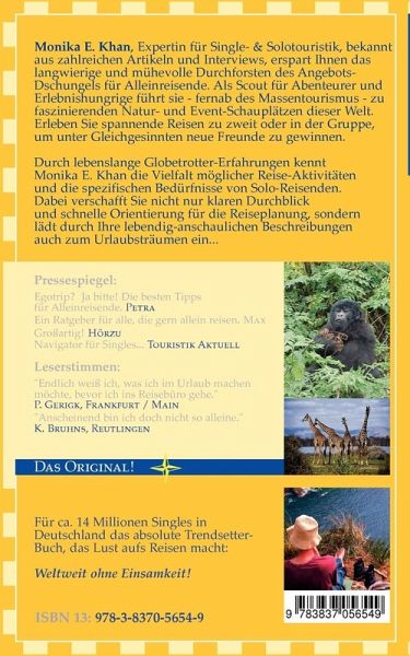 Weltweit ohne Einsamkeit - Band 2: Spurensuche:Städte-Reisen, Silvester-Reisen, Studien- und Erlebnis-Reisen, Single mit Kind-ReisenMonika E. Khan, Expertin für Single- & Solotouristik, bekannt aus zahlreichen Artikeln und Interviews, erspart Ihnen das langwierige und mühevolle Durchforsten des Angebots-Dschungels für Alleinreisende. Als Scout für Abenteurer und Erlebnishungrige führt sie - fernab des Massentourismus - zu faszinierenden Natur- und Event-Schauplätzen dieser Welt.Erleben Sie spannende Reisen zu zweit oder in der Gruppe, um unter Gleichgesinnten neue Freunde zu gewinnen.Durch lebenslange Globetrotter-Erfahrungen kennt Monika E. Khan die Vielfalt möglicher Reise-Aktivitäten und die spezifischen Bedürfnisse von Solo-Reisenden. Dabei verschafft Sie nicht nur klaren Durchblick und schnelle Orientierung für die Reiseplanung, sondernlädt durch Ihre lebendig-anschaulichen Beschreibungen auch zum Urlaubsträumen ein...