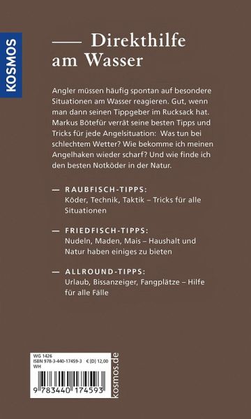 Ob stumpfe Haken, schlechtes Wetter oder Notköder aus der Natur - Markus Bötefür weiß für jedes Angelproblem Abhilfe. Sein kompakter Ratgeber bietet praktische Lösungen zum schnellen Nachschlagen vor Ort. Im anschaulichen Doppelseitenprinzip wird jeweils ein Tipp oder Trick mit zugehörigem Foto vorgestellt. Direkthilfe am Wasser - gleichermaßen hilfreich für Einsteiger und Profis.