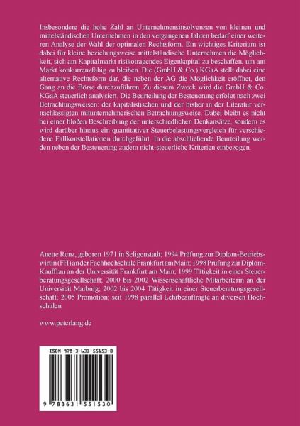 Insbesondere die hohe Zahl an Unternehmensinsolvenzen von kleinen und mittelständischen Unternehmen in den vergangenen Jahren bedarf einer weiteren Analyse der Wahl der optimalen Rechtsform. Ein wichtiges Kriterium ist dabei für kleine beziehungsweise mittelständische Unternehmen die Möglichkeit, sich am Kapitalmarkt risikotragendes Eigenkapital zu beschaffen, um am Markt konkurrenzfähig zu bleiben. Die (GmbH & Co.) KGaA stellt dabei eine alternative Rechtsform dar, die neben der AG die Möglichkeit eröffnet, den Gang an die Börse durchzuführen. Zu diesem Zweck wird die GmbH & Co. KGaA steuerlich analysiert. Die Beurteilung der Besteuerung erfolgt nach zwei Betrachtungsweisen: der kapitalistischen und der bisher in der Literatur vernachlässigten mitunternehmerischen Betrachtungsweise. Dabei bleibt es nicht bei einer bloßen Beschreibung der unterschiedlichen Denkansätze, sondern es wird darüber hinaus ein quantitativer Steuerbelastungsvergleich für verschiedene Fallkonstellationen durchgeführt. In die abschließende Beurteilung werden neben der Besteuerung zudem nicht-steuerliche Kriterien einbezogen.