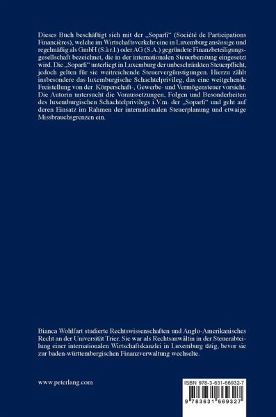 Dieses Buch beschäftigt sich mit der "Soparfi" (Société de Participations Financières), welche im Wirtschaftsverkehr eine in Luxemburg ansässige und regelmäßig als GmbH (S.à r.l.) oder AG (S.A.) gegründete Finanzbeteiligungsgesellschaft bezeichnet, die in der internationalen Steuerberatung eingesetzt wird. Die "Soparfi" unterliegt in Luxemburg der unbeschränkten Steuerpflicht, jedoch gelten für sie weitreichende Steuervergünstigungen. Hierzu zählt insbesondere das luxemburgische Schachtelprivileg, das eine weitgehende Freistellung von der Körperschaft-, Gewerbe- und Vermögensteuer vorsieht. Die Autorin untersucht die Voraussetzungen, Folgen und Besonderheiten des luxemburgischen Schachtelprivilegs i.V.m. der "Soparfi" und geht auf deren Einsatz im Rahmen der internationalen Steuerplanung und etwaige Missbrauchsgrenzen ein.