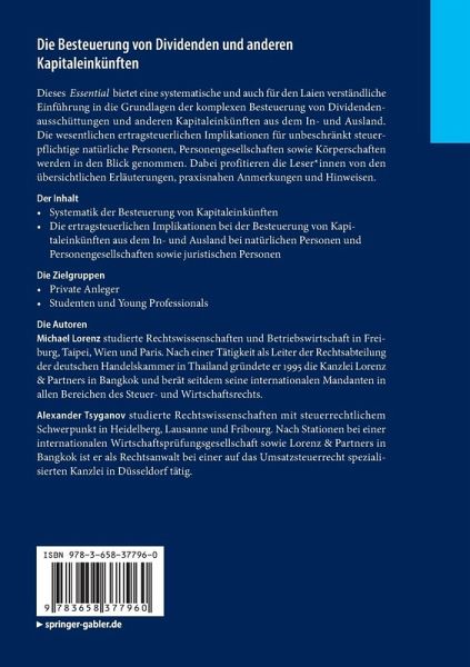 Dieses Essential bietet eine systematische und auch für den Laien verständliche Einführung in die Grundlagen der komplexen Besteuerung von Dividendenausschüttungen und anderen Kapitaleinkünften aus dem In- und Ausland. Die wesentlichen ertragsteuerlichen Implikationen für unbeschränkt steuerpflichtige natürliche Personen, Personengesellschaften sowie Körperschaften werden in den Blick genommen. Dabei profitieren die Leser_innen von den übersichtlichen Erläuterungen, praxisnahen Anmerkungen und Hinweisen.