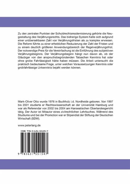 Zu den zentralen Punkten der Schuldrechtsmodernisierung gehörte die Neugestaltung des Verjährungsrechts. Das bisherige System hatte sich aufgrund einer unübersehbaren Zahl von Verjährungsfristen als zu komplex erwiesen. Die Reform führte zu einer erheblichen Reduzierung der Zahl der Fristen und zu einem deutlich größeren Anwendungsbereich der Regelverjährungsfrist. Der notwendige Preis für die Vereinfachung ist die Einführung des subjektiven Verjährungsbeginns. Der Verjährungsbeginn hängt nun davon ab, ob der Gläubiger von den anspruchsbegründenden Tatsachen Kenntnis hat oder ohne grobe Fahrlässigkeit hätte haben müssen. Die Arbeit untersucht die praktisch bedeutsame Frage, unter welchen Voraussetzungen Kenntnis oder grobfahrlässige Unkenntnis bejaht werden können.