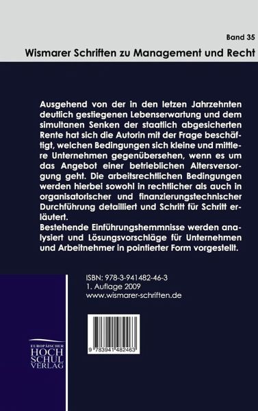 Ausgehend von der in den letzen Jahrzehnten deutlich gestiegenen Lebenserwartung und dem simultanen Senken der staatlich abgesicherten Rente hat sich die Autorin mit der Frage beschäftigt, welchen Bedingungen sich kleine und mittlere Unternehmen gegenübersehen, wenn es um das Angebot einer betrieblichen Altersversorgung geht. Die arbeitsrechtlichen Bedingungen werden hierbei sowohl in rechtlicher als auch in organisatorischer und finanzierungstechnischer Durchführung detailliert und Schritt für Schritt erläutert.