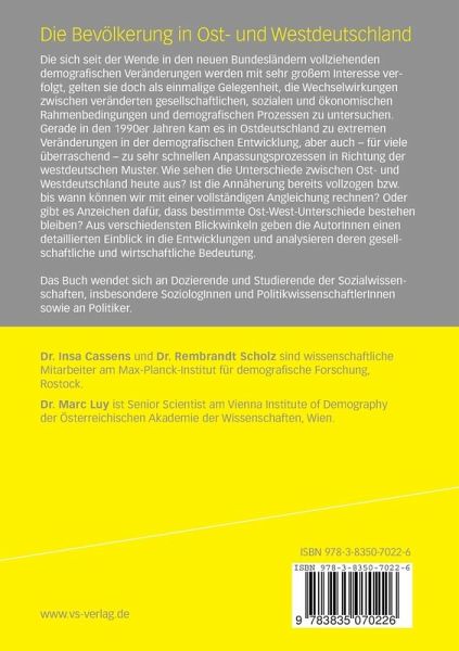 Insa Cassens, Marc Luy, Rembrandt Scholz 1945 ging der Zweite Weltkrieg zu Ende, das besiegte Deutschland wurde unter den Besatzungsmächten USA, Großbritannien, Frankreich und der Sowjetunion auf- teilt. Zwei Blöcke entstanden: Die Integration der westlichen Besatzungszonen in die Gemeinschaft der Westmächte und die des östlichen Teils in das System der UdSSR fand im Jahr 1949 ihren Höhepunkt mit den Gründungen der Bundesre- blik Deutschland (BRD) und der Deutschen Demokratischen Republik (DDR). In der parlamentarischen Demokratie einerseits und der kommunistischen Volks- mokratie andererseits waren die Menschen in diesen zwei Staaten in den folgenden 60 Jahren gänzlich unterschiedlichen politischen, wirtschaftlichen und gesellschaft- chen Rahmenbedingungen ausgesetzt. Beim Mauerfall 1989 trafen so auch zwei Bevölkerungen aufeinander, die sich inzwischen bezüglich vieler demografischer, ökonomischer und sozialer Charakteristika deutlich unterschieden. Wie haben sich diese Unterschiede nach einer solchen gesellschaftspolitischen Umbruchsituation entwickelt? In welcher Form und mit welcher zeitlichen Verzögerung haben Anp- sungsprozesse zwischen den wiedervereinigten Staaten stattgefunden? Diese sp- nenden Forschungsfragen standen im Mittelpunkt eines Workshops, der gemeinsam vom Rostocker Zentrum zur Erforschung des Demografischen Wandels und der Deutschen Gesellschaft für Demographie im Rahmen der Statistischen Woche 2006 in Dresden organisiert wurde. Antworten und Ergebnisse sind nun im vorliegenden Buch zusammengestellt und stehen der interessierten Öffentlichkeit zur Verfügung.