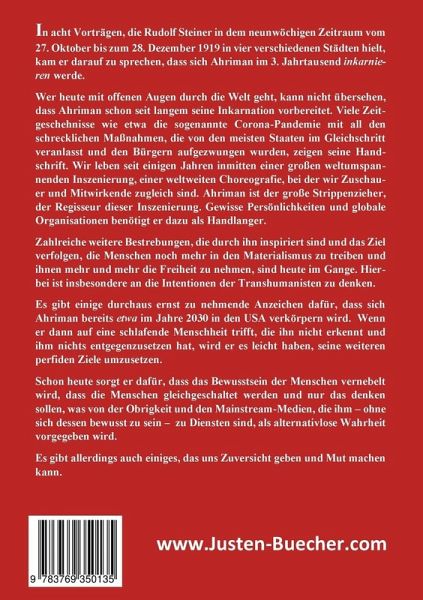 In acht Vorträgen, die Rudolf Steiner in dem neunwöchigen Zeitraum vom 27. Oktober bis zum 28. Dezember 1919 in vier verschiedenen Städten hielt, kam er darauf zu sprechen, dass sich Ahriman im 3. Jahrtausend inkarnieren werde. Wer heute mit offenen Augen durch die Welt geht, kann nicht übersehen, dass Ahriman schon seit langem seine Inkarnation vorbereitet. Viele Zeitgeschehnisse wie etwa die sogenannte Corona-Pandemie mit all den schrecklichen Maßnahmen, die von den meisten Staaten im Gleichschritt veranlasst und den Bürgern aufgezwungen wurden, zeigen seine Handschrift. Wir leben seit einigen Jahren inmitten einer großen weltumspannenden Inszenierung, einer weltweiten Choreografie, bei der wir Zuschauer und Mitwirkende zugleich sind. Ahriman ist der große Strippenzieher, der Regisseur dieser Inszenierung. Gewisse Persönlichkeiten und globale Organisationen benötigt er dazu als Handlanger. Zahlreiche weitere Bestrebungen, die durch ihn inspiriert sind und das Ziel verfolgen, die Menschen noch mehr in den Materialismus zu treiben und ihnen mehr und mehr die Freiheit zu nehmen, sind heute im Gange. Hierbei ist insbesondere an die Intentionen der Transhumanisten zu denken. Es gibt einige durchaus ernst zu nehmende Anzeichen dafür, dass sich Ahriman bereits etwa im Jahre 2030 in den USA verkörpern wird. Wenn er dann auf eine schlafende Menschheit trifft, die ihn nicht erkennt und ihm nichts entgegenzusetzen hat, wird er es leicht haben, seine weiteren perfiden Ziele umzusetzen. Schon heute sorgt er dafür, dass das Bewusstsein der Menschen vernebelt wird, dass die Menschen gleichgeschaltet werden und nur das denken sollen, was von der Obrigkeit und den Mainstream-Medien, die ihm - ohne sich dessen bewusst zu sein - zu Diensten sind, als alternativlose Wahrheit vorgegeben wird. Es gibt allerdings auch einiges, das uns Zuversicht geben und Mut machen kann.