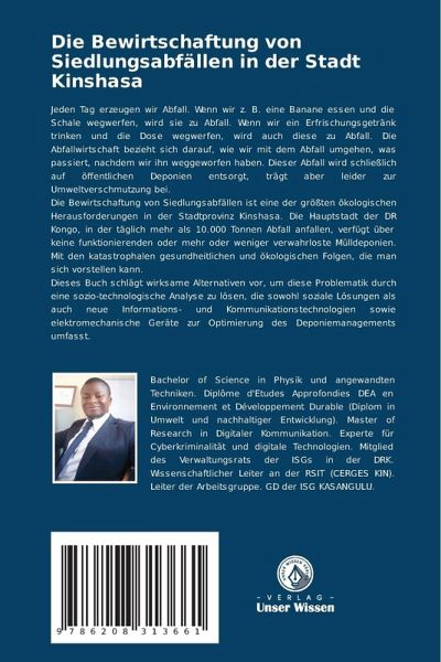 Jeden Tag erzeugen wir Abfall. Wenn wir z. B. eine Banane essen und die Schale wegwerfen, wird sie zu Abfall. Wenn wir ein Erfrischungsgetränk trinken und die Dose wegwerfen, wird auch diese zu Abfall. Die Abfallwirtschaft bezieht sich darauf, wie wir mit dem Abfall umgehen, was passiert, nachdem wir ihn weggeworfen haben. Dieser Abfall wird schließlich auf öffentlichen Deponien entsorgt, trägt aber leider zur Umweltverschmutzung bei.Die Bewirtschaftung von Siedlungsabfällen ist eine der größten ökologischen Herausforderungen in der Stadtprovinz Kinshasa. Die Hauptstadt der DR Kongo, in der täglich mehr als 10.000 Tonnen Abfall anfallen, verfügt über keine funktionierenden oder mehr oder weniger verwahrloste Mülldeponien. Mit den katastrophalen gesundheitlichen und ökologischen Folgen, die man sich vorstellen kann.Dieses Buch schlägt wirksame Alternativen vor, um diese Problematik durch eine sozio-technologische Analyse zu lösen, die sowohl soziale Lösungen als auch neue Informations- und Kommunikationstechnologien sowie elektromechanische Geräte zur Optimierung des Deponiemanagements umfasst.