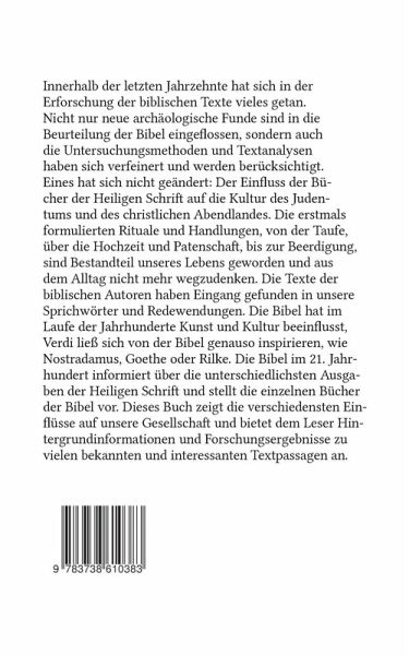Innerhalb der letzten Jahrzehnte hat sich in der Erforschung der biblischen Texte vieles getan. Nicht nur neue archäologische Funde sind in die Beurteilung der Bibel eingeflossen, sondern auch die Untersuchungsmethoden und Textanalysen haben sich verfeinert und werden berücksichtigt. Eines hat sich nicht geändert: Der Einfluss der Bücher der Heiligen Schrift auf die Kultur des Judentums und des christlichen Abendlandes. Die erstmals formulierten Rituale und Handlungen, von der Taufe, über die Hochzeit und Patenschaft, bis zur Beerdigung, sind Bestandteil unseres Lebens geworden und aus dem Alltag nicht mehr wegzudenken. Die Texte der biblischen Autoren haben Eingang gefunden in unsere Sprichwörter und Redewendungen. Die Bibel hat im Laufe der Jahrhunderte Kunst und Kultur beeinflusst, Verdi ließ sich von der Bibel genauso inspirieren, wie Nostradamus, Goethe oder Rilke. Die Bibel im 21. Jahrhundert informiert über die unterschiedlichsten Ausgaben der Heiligen Schrift und stellt die einzelnen Bücher der Bibel vor. Dieses Buch zeigt die verschiedensten Einflüsse auf unsere Gesellschaft und bietet dem Leser Hintergrundinformationen und Forschungsergebnisse zu vielen bekannten und interessanten Textpassagen an. Unter diesem Aspekt wird auf über 600 Seiten jedes Buch der Bibel vorgestellt und besprochen. Die Arbeit an dem Werk 'Die Bibel im 21. Jahrhundert' begann im Januar 2001 und wurde im April 2015 vollendet.