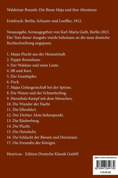 Waldemar Bonsels: Die Biene Maja und ihre Abenteuer Lesefreundlicher Großdruck in 16-pt-Schrift Großformat, 210 x 297 mm Berliner Ausgabe, 2023 Durchgesehener Neusatz bearbeitet und eingerichtet von Theodor Borken Erstdruck: Berlin, Schuster und Loeffler, 1912. Inhaltsverzeichnis: Die Biene Maja und ihre Abenteuer. 1. Majas Flucht aus der Heimatstadt. 2. Peppis Rosenhaus. 3. Der Waldsee und seine Leute. 4. Iffi und Kurt. 5. Der Grashüpfer. 6. Puck. 7. Majas Gefangenschaft bei der Spinne. 8. Die Wanze und der Schmetterling. 9. Hannibals Kampf mit dem Menschen. 10. Die Wunder der Nacht. 11. Die Elfenfahrt. 12. Der Dichter Alois Siebenpunkt. 13. Die Räuberburg. 14. Die Flucht. 15. Die Heimkehr. 16. Die Schlacht der Bienen und Hornissen. 17. Die Freundin der Königin. Der Text dieser Ausgabe wurde behutsam an die neue deutsche Rechtschreibung angepasst. Umschlaggestaltung von Thomas Schultz-Overhage unter Verwendung des Bildes: Berndt Beetz, Die Biene Maja, 2023. Gesetzt aus der Minion Pro, 16 pt. Henricus - Edition Deutsche Klassik GmbH