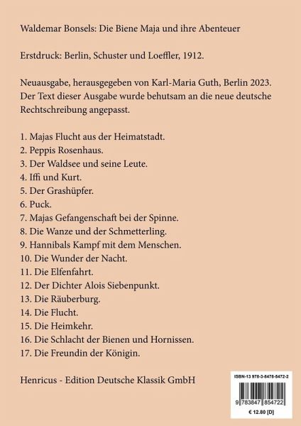 Waldemar Bonsels: Die Biene Maja und ihre AbenteuerLesefreundlicher Großdruck in 16-pt-SchriftGroßformat, 210 x 297 mmBerliner Ausgabe, 2023Durchgesehener Neusatz bearbeitet und eingerichtet von Theodor BorkenErstdruck: Berlin, Schuster und Loeffler, 1912.Inhaltsverzeichnis:Die Biene Maja und ihre Abenteuer.1. Majas Flucht aus der Heimatstadt.2. Peppis Rosenhaus.3. Der Waldsee und seine Leute.4. Iffi und Kurt.5. Der Grashüpfer.6. Puck.7. Majas Gefangenschaft bei der Spinne.8. Die Wanze und der Schmetterling.9. Hannibals Kampf mit dem Menschen.10. Die Wunder der Nacht.11. Die Elfenfahrt.12. Der Dichter Alois Siebenpunkt.13. Die Räuberburg.14. Die Flucht.15. Die Heimkehr.16. Die Schlacht der Bienen und Hornissen.17. Die Freundin der Königin.Der Text dieser Ausgabe wurde behutsam an die neue deutsche Rechtschreibung angepasst.Umschlagabbildung: Berndt Beetz, Die Biene Maja, 2023Gesetzt aus der Minion Pro, 16 pt.Henricus - Edition Deutsche Klassik GmbH