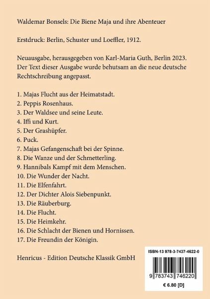 Waldemar Bonsels: Die Biene Maja und ihre AbenteuerErstdruck: Berlin, Schuster und Loeffler, 1912.Inhaltsverzeichnis:Die Biene Maja und ihre Abenteuer.1. Majas Flucht aus der Heimatstadt.2. Peppis Rosenhaus.3. Der Waldsee und seine Leute.4. Iffi und Kurt.5. Der Grashüpfer.6. Puck.7. Majas Gefangenschaft bei der Spinne.8. Die Wanze und der Schmetterling.9. Hannibals Kampf mit dem Menschen.10. Die Wunder der Nacht.11. Die Elfenfahrt.12. Der Dichter Alois Siebenpunkt.13. Die Räuberburg.14. Die Flucht.15. Die Heimkehr.16. Die Schlacht der Bienen und Hornissen.17. Die Freundin der Königin.Neuausgabe, herausgegeben von Karl-Maria Guth, Berlin 2023.Der Text dieser Ausgabe wurde behutsam an die neue deutsche Rechtschreibung angepasst.Umschlagabbildung: Berndt Beetz, Die Biene Maja, 2023Gesetzt aus der Minion Pro, 11 pt.Die Sammlung Hofenberg erscheint im Verlag Henricus - Edition Deutsche Klassik GmbH, Berlin