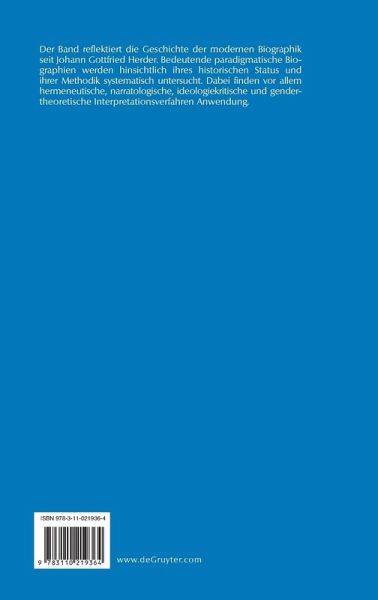 Der Band reflektiert die Geschichte der modernen Biographik seit Johann Gottfried Herder. Bedeutende paradigmenbildende Biographien werden hinsichtlich ihres historischen Status und ihrer Methodik systematisch untersucht. Dabei finden vor allem hermeneutische, narratologische, ideologiekritische und gendertheoretische Interpretationsverfahren Anwendung. Das Werk wird wie der Band Die Biographie - Zur Grundlegung ihrer Theorie im Auftrag des Ludwig Boltzmann Instituts für Geschichte und Theorie der Biographie in Wien herausgegeben.