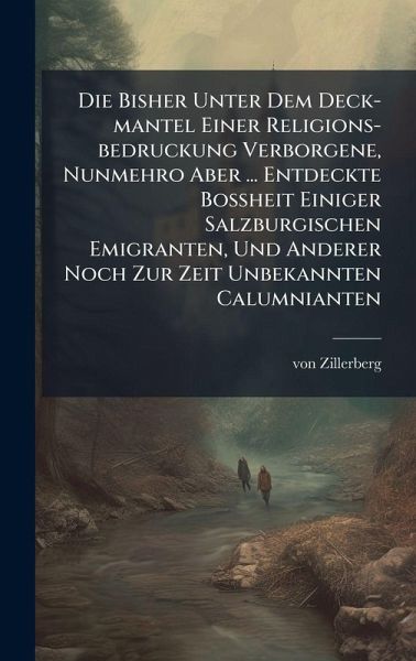 An historical account titled "Die Bisher Unter Dem Deck-mantel Einer Religions-bedruckung Verborgene, Nunmehro Aber ... Entdeckte BoÃheit Einiger Salzburgischen Emigranten, Und Anderer Noch Zur Zeit Unbekannten Calumnianten" by ... von Zillerberg reveals previously hidden malice under the guise of religious oppression perpetrated by Salzburg emigrants and other unknown slanderers. This work provides insight into the experiences of the Salzburg emigrants and others during the 18th century, shedding light on the religious and social challenges they faced. It is a valuable resource for researchers and historians interested in European history, religious history, and the history of emigration and immigration. This work has been selected by scholars as being culturally important, and is part of the knowledge base of civilization as we know it. This work was reproduced from the original artifact, and remains as true to the original work as possible. Therefore, you will see the original copyright references, library stamps (as most of these works have been housed in our most important libraries around the world), and other notations in the work. This work is in the public domain in the United States of America, and possibly other nations. Within the United States, you may freely copy and distribute this work, as no entity (individual or corporate) has a copyright on the body of the work. As a reproduction of a historical artifact, this work may contain missing or blurred pages, poor pictures, errant marks, etc. Scholars believe, and we concur, that this work is important enough to be preserved, reproduced, and made generally available to the public. We appreciate your support of the preservation process, and thank you for being an important part of keeping this knowledge alive and relevant.